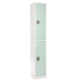 Add Alpine 2-Tier Steel Lockers to your space as a sports or student locker. These storage lockers are made with heavy-duty steel for durability and have rubber feet for sturdiness. The dual locking mechanisms keep your items safe and secure. Made from durable steel. Each locker has 2 tiers with built-in shelves and 2 hooks for plenty of storage. Vented doors help prevent odor and reduce bacteria. Dual-locking mechanisms help keep contents secure. Name tag slots allow for personalization. Rubber feet on the bottoms provide stability. Each locker includes 2 keys and assembly hardware. Assembly required. Backed by the manufacturer's 1-year warranty. Stylish misty green design.