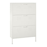 Make this shoe cabinet part of your entry area to keep footwear off of your floor. The storage cabinet is made of strong and dependable steel and has room for up to 18 pairs of shoes. Made of steel to handle everyday use. 3 metal drawers fold out to allow easy access. Houses up to 18 pairs of shoes up to US Womens size 14. Locker-style storage includes a wall anchor kit and instructions. Weight capacity tested to support 65 lb. Assembly required. Backed by the manufacturers 1-year limited warranty. Soft white for a neutral appearance.