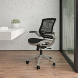 Refresh your office space with the handsome Flash Furniture Mesh Mid-Back Executive Office Chair. This modern office chair boasts built-in lumbar support that cradles your spine for maximum comfort during the workday. A waterfall seat slopes downward to help reduce stress on your legs during long periods of sitting. Mid back office chair. Padded seat. Mesh upholstery. Lumbar support. Waterfall seat. Seat height adjustments. Tilt tension and tilt lock. Padded flip-up arms. Heavy-duty base with dual wheel casters. Assembly required. Backed by the manufacturers 2-year limited warranty. Tested to meet ANSI/BIFMA Performance Standards - Manufacturer testing has been conducted on this product to meet specific performance requirements and safety standards set forth by the American National Standards Institute (ANSI) and the Business and Institutional Furniture Manufacturers.