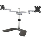 ADJUSTABLE SET UP: Double computer monitor stand w/ cable management clips along the silver arms & center pole to organize cables for a tidy workspace & hold incl. articulation tension adjustment tool WIDE RANGE OF MOTION: Ergonomic monitor stand w/ +90 deg./-40 deg. tilt, +/-90 deg. swivel, 360 deg. rotating display, & adjustable height along 16.7in (42.4 cm) pole; Arms can rotate for back-to-back monitor setup STABLE & NON-SLIP: Aluminum free standing monitor mount w/ u-shaped base (11.8in (300mm) x 20.5in (520mm)) for max stability & flexible placement; Anti-slip rubber pads prevent scratches on desk surface EASY INSTALLATION: Dual monitor stand w/ convenient slide-and-click design makes assembling the monitor arms & VESA adapters easy, reducing the set-up time ; Align monitors w/ micro height adjustment 32 INCH HEAVY DUTY MONITOR STAND: VESA 75x75/100x100mm compatible desktop multi monitor stand supports 2 large displays up to 32in (17.6lb/8kg) per screen w/horizontal articulation & height adjustment