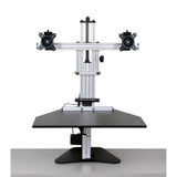 Standing and moving during the day can provide a wide array of health benefits over sitting all day long. This adjustable stand lets you stand for portions of the day, and then sit when you start to tire. Accommodates 2 monitors weighing up to 10 lb and measuring 25in wide (not diagonally) each. VESA mounts have a 75 x 75 or 100 x 100 pattern for easy compatibility. Mounts can tilt, pan and rotate for a great viewing angle from almost anywhere. Slide the mounts horizontally to position the monitors as close together or far apart as desired. Monitors can be adjusted independently of each other. Flush-mounted push button controls the nitrogen gas spring for fast, easy adjustments. Height can be adjusted approximately 14in from your desk surface up to 40 1/2in. Steel base offers strength and stability. Includes 1 stabilization leg. Partially assembled.